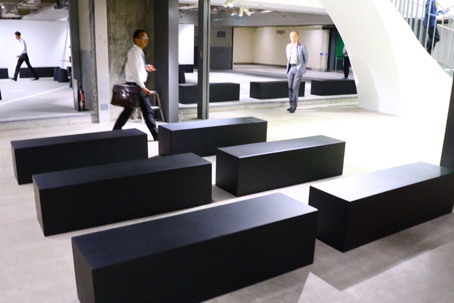 地下は4階まで伸びており、いたるところにベンチが設置されており、何もないスペースが多くある。公園らしく、何でも自由にできる余白をもうけるのが狙いだ。天井や壁はコンクリートの打ちっ放しで、ところどころに古いタイルが見える。取り壊す最中に見つけた、図面にも載っていないタイルを、あえて残しているのだ。遊び心でもあるし、銀座ソニービルの歴史を感じ部分と言える。