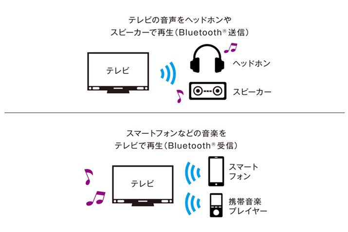 BluetoothコーデックはSBC。映像とのズレが生じないように、音声にあわせて映像を遅らせる形で遅延対策もされている。ちなみに、送信だけでなく受信にも対応しているので、たとえばスマホ内にある音楽ファイルをBluetoothでテレビに飛ばして、テレビの内蔵スピーカーで鳴らすこともできる