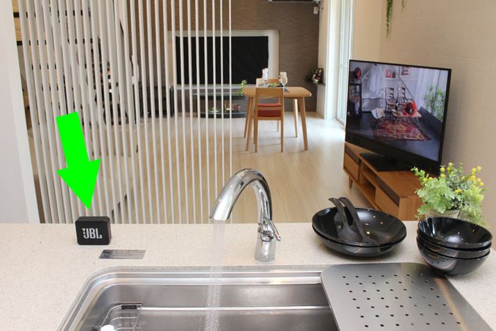 キッチンで洗い物をしながらテレビを楽しむイメージ。オートターン機能でテレビをキッチンに向けつつ、同時にBluetoothスピーカーで音声を聞くといったことが可能だ。もちろん、Bluetoothで音声送信しつつテレビの内蔵スピーカーからも同時に音声出力できるので、ほかの家族は同時にリビングでテレビを楽しめる