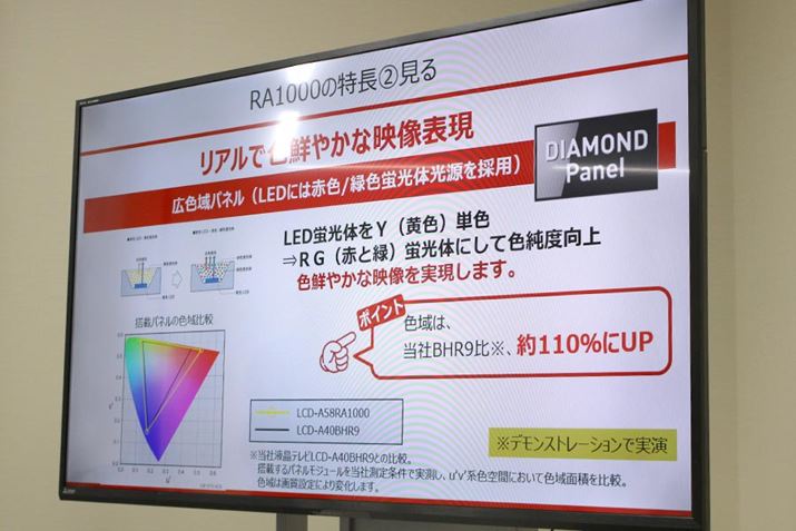 同社の液晶テレビには、バックライトにレーザー光源を採用したフラッグシップモデル「LS3」シリーズがあるが、今回のRA1000はその次位に位置づけられ、LEDバックライトを採用する。このLEDバックライトが新構造となっているのがミソで、赤色蛍光体と緑色蛍光体に青色LEDを組み合わせて白色発光させる仕組みを採用。これにより、R・G・Bそれぞれの色純度を向上させ、色域の拡大に成功したという。