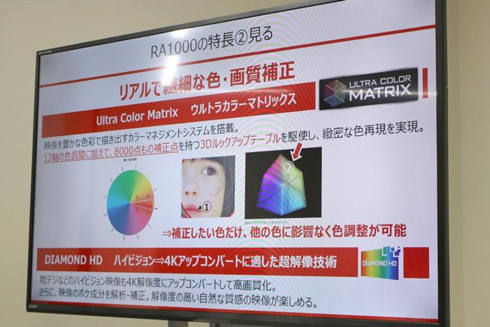 映像エンジンには、三菱電機独自の「DIAMOND エンジン4K」の最新世代を採用。新しいカラーマネジメントシステム「ウルトラカラーマトリクス」を採用することで、色補正の精度を高めて自然な発色の再現を図っている。また、地デジ放送のフルハイビジョン映像(2K)を4K相当にアップコンバートする超解像技術「DIAMOND HD」も搭載する。