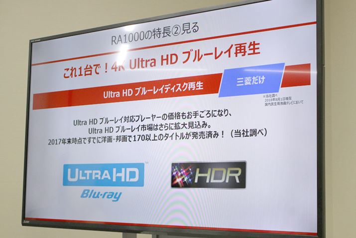 もうひとつ、テレビ本体にBDドライブを搭載することもREALシリーズの特徴だ。RA1000で大きなトピックなのは、この内蔵ディスクドライブがUltra HD Blu-ray(4K Blu-ray)の再生に対応したこと。テレビ単体でUltra HD Blu-rayの再生が行える製品はRA1000だけとなる(2018年8月21日時点)。
