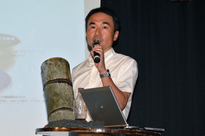 ミロクテクノウッドの山本敦。手に持っているのは、「AH-D9200」で使われている孟宗竹だ。1本の孟宗竹で約4台分のハウジングが取れるという