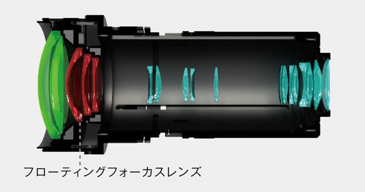 像の湾曲を補正する浮遊レンズ群をフォーカシングレンズ群の前面に配置し、フィーカシングレンズ群と同時に動かすことで、ゆがみの少ない映像を実現する4K ARC-Fレンズ