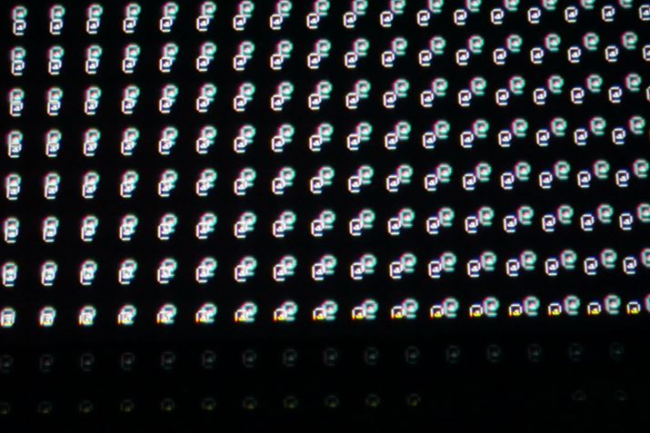「VPL-VW855」と「VPL-VW745」を同時投射して画面周辺部の画質を比べてみた様子。@マークがくっきりと表現できているのが「VPL-VW855」だ