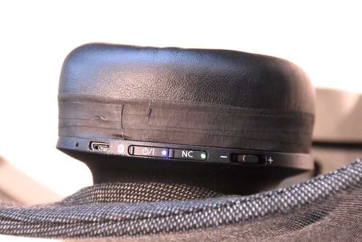 左のヘッドホンの下部には、電源ボタンやノイズキャンセリングのオン/オフボタンなど、各種操作ボタンを搭載
