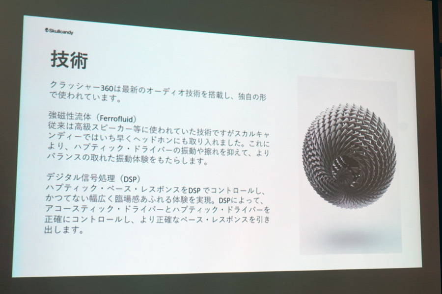 「Crusher」シリーズは「Haptic Bass(ハプティックベース)」と呼ばれる重低音専用のウーハーを搭載することで“物理的に震える”という機能を実現している。初代「Crusher」はこの専用のウーハーがモノラル再生だったが、「CRUSHER WIRELESS」ではステレオ再生対応の「Stereo Haptic Bass(ステレオハプティックベース)」へと進化。そして今回の「Crusher 360」では、この「Stereo Haptic Bass」をベースにさらなる進化を遂げたという。