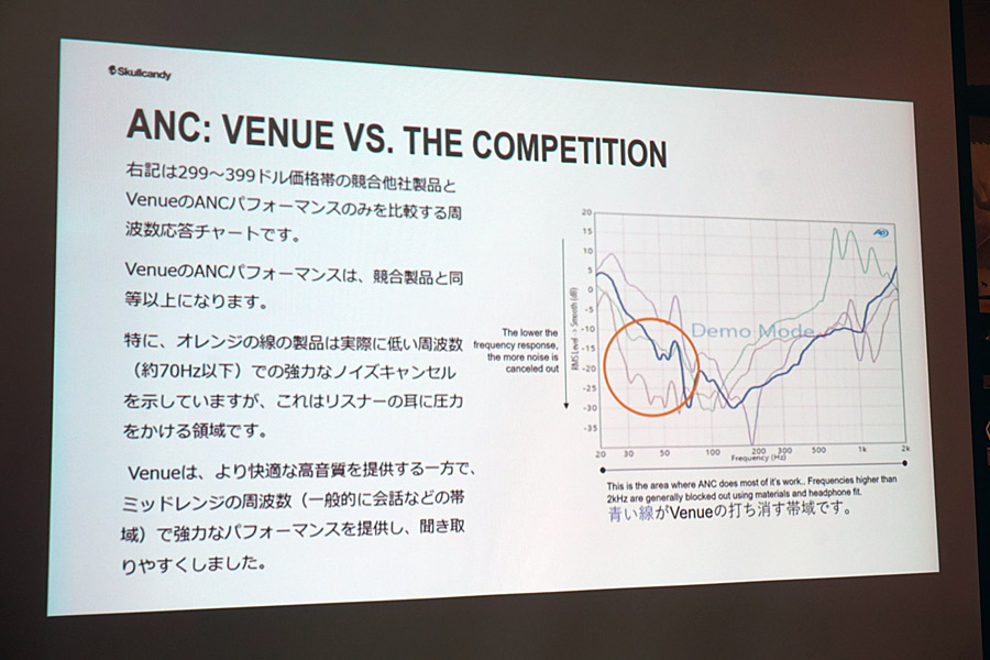 製品の特徴であるアクティブノイズキャンセリング性能については、高精度なノイズキャンセリング性能と高音質をバランスよく実現するために、アクティブノイズキャンセリングに関する世界有数の専門家と共同研究を実施し、「Venue」専用に開発。飛行機だけでなく日常的な生活でも使うことを想定して開発したとうことで、特に会話などのミッドレンジ帯域で威力を発揮するようにノイズキャンセリング機能をチューニングしたという。マイクについても、ハウジングの内側と外側にそれぞれ2基搭載。ノイズを正確に把握してコントールすることで、高いノイズキャンセル性能を実現したという。