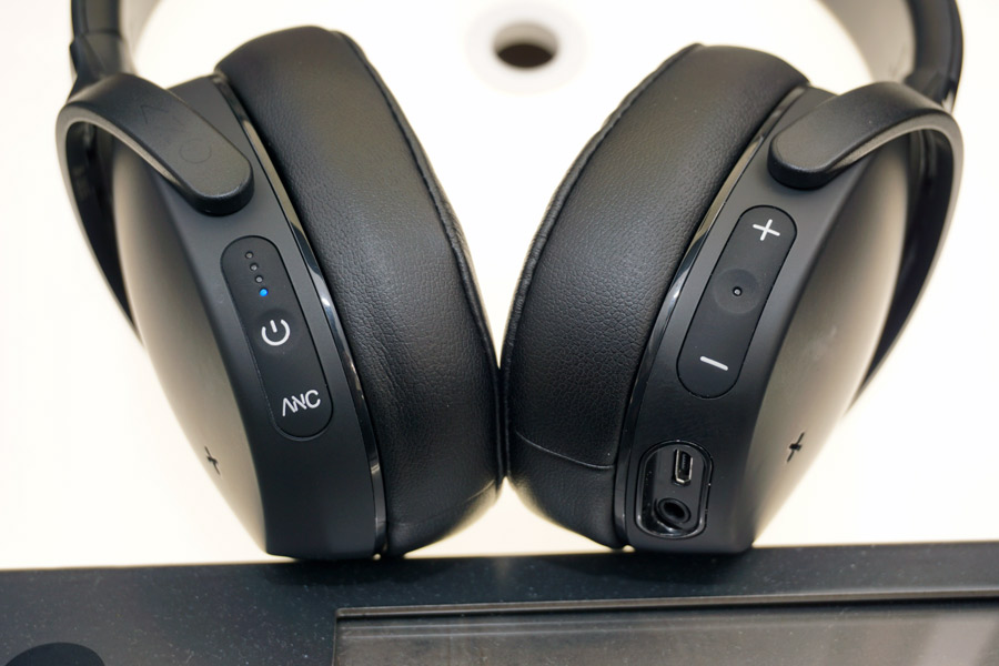 ハウジング部に設けられたコントロールボタン。音楽を再生していない場合でも、左側のANCボタンを押すだけでアクティブノイズキャンセリング機能を利用できる。なお、同機能は内蔵バッテリーからの電源を供給する形となっており、バッテリー残量がない場合は利用できない