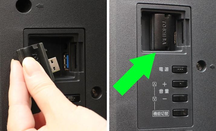 新4K8K衛星放送に対応する新しいCASは、従来のB-CASカード方式ではなくICチップ化されてテレビ内に組み込まれる形となった。写真は、BS/110°CS 4K受信チューナーを搭載する東芝の4Kテレビで、ドングル化された新CASが装着される