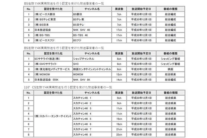 新4K8K衛星放送を実施予定の放送事業者一覧(画像はクリックで拡大)。くわしくは、総務省のサイトを参照(http://www.soumu.go.jp/menu_seisaku/ictseisaku/housou_suishin/4k8k_suishin/about.html)