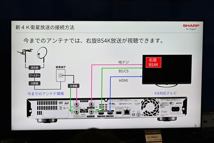 ちなみに、新4K衛星放送の放送波は、これまでのBS/110CS放送で使われていた右旋に加え、さらに周波数の高い左旋の電波も使われている。すでにBS/110CS放送を楽しんでいる人であれば、従来製品から新製品にアンテナケーブルを付け替えるだけで右旋のBS4K放送を楽しめるが、左旋のBS4K・110度CS4K放送まで楽しみたい場合は、パラボナアンテナや混合器、分配器といった放送設備までアップデートしておかなければいけないので注意してほしい。