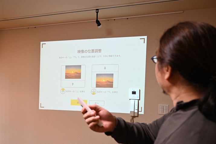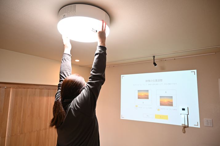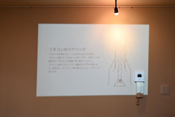 天井照明の壁スイッチを押して「popIn Aladdin」の電源を入れると初期設定の画面が立ち上がる。この時点ではフォーカス調整が終わってないので、画面はかなりぼやけて設定方法が全然見えないが、スピーカーから音声ガイダンスが流れるので問題ない