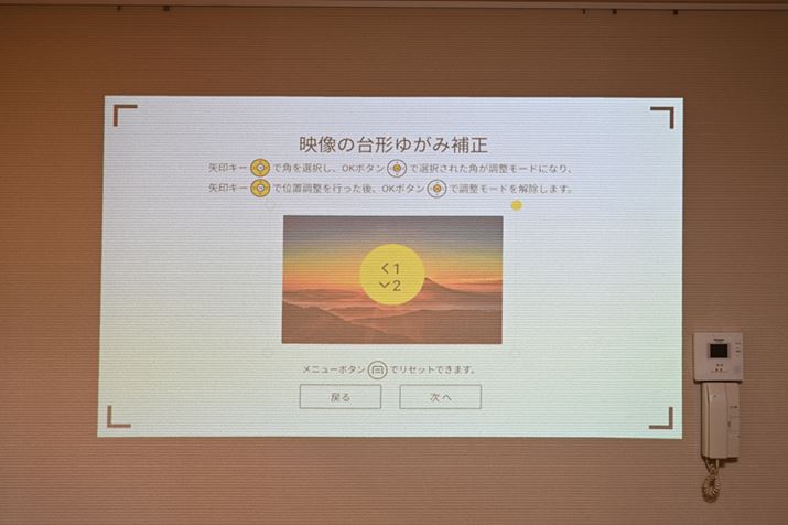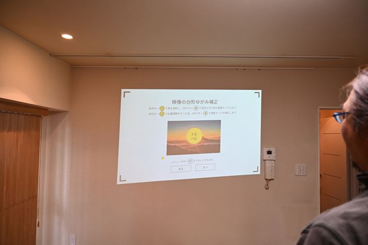 壁に対してやや斜めになる形で投写したが、かなり強力な台形ゆがみ補正のおかげで、しっかりと長方形の画面を再現することができた。ただし、台形ゆがみ補正を多用すると画面が小さくなる点は注意したい