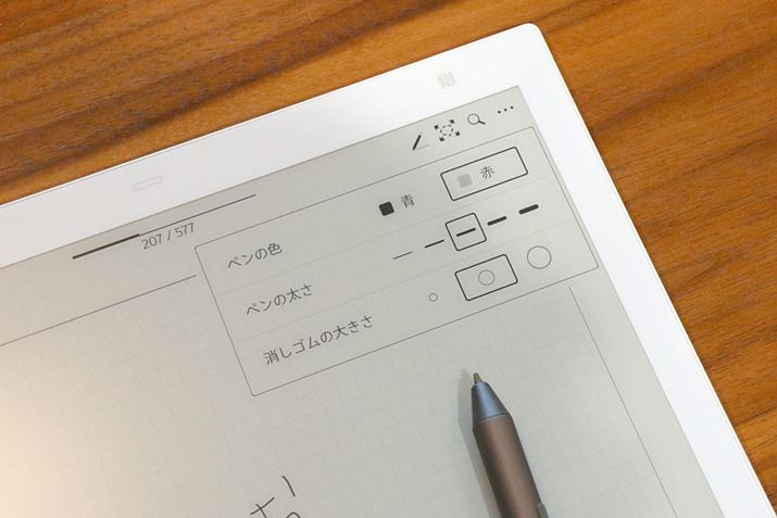 専用ペンでの書き味は、紙のノートと鉛筆のようで、適度な摩擦があり、自然な書き味だ。電子ペーパーのため、ペンを早く動かすと描写されるまでに少し待たされることもあるが、メモやアイデアスケッチなどには十分利用できるスピードだ。