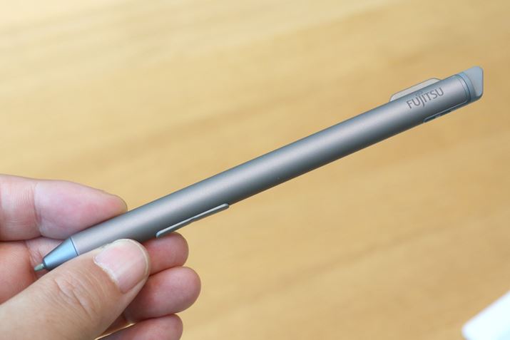 自然な書き味の専用ペン。2つのボタンがあり、ペン先に近いほうには消しゴム機能が割り当てられている。専用ペンは本体の両サイドの溝にに固定可能