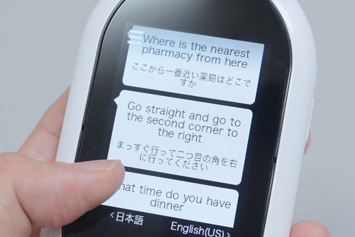 「日本語→英語」で使用している様子。入力言語(日本語)、出力言語(英語)ともに、大きなディスプレイに文字で表示されるので安心!