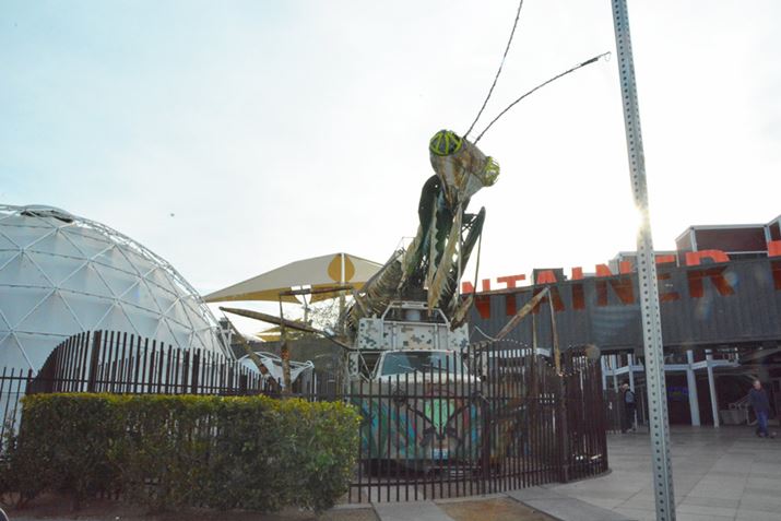 クルマに乗って、ラスベガスの街中へ出発! とあるポイントでクルマを停めると、サングラスから「観光案内が必要かどうか?」との質問が流れます。頭を縦に振ることで「YES」と意思表示すると、クルマが止まった横にあるレストランやレコードショップ、火を噴くカマキリのいるショッピングモールなどの説明を行ってくれました。