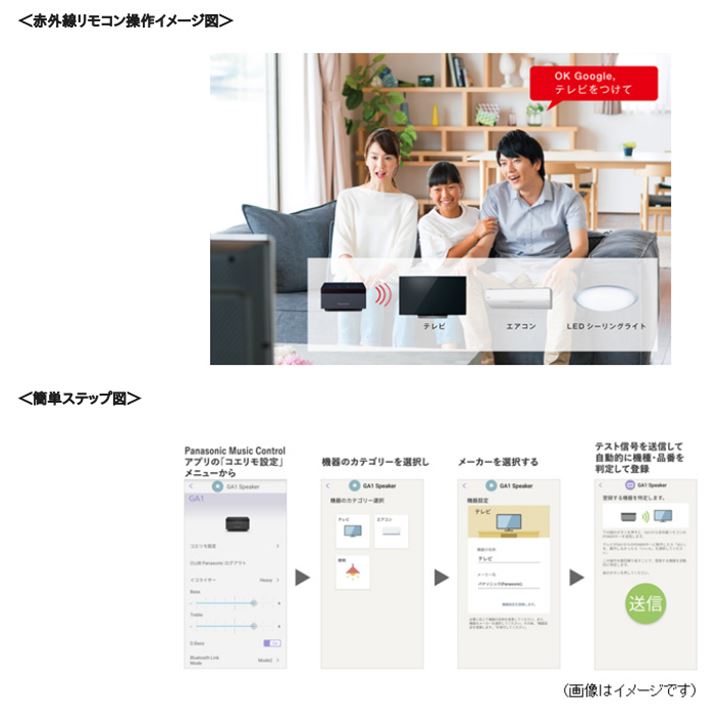 今回発表された「コエリモ」は、Googleアシスタントのフル機能に加え、声で家電を操作できる赤外線リモコン機能を本体に内蔵したのが最大の特徴。音声操作に対応していない家電でも、専用アプリ「Panasonic Music Control」で数ステップの設定をするだけで、声で家電を操作できるようになる。スマートスピーカーと組み合わせて使うスマートリモコンと異なり、スマートリモコン機能が本体に内蔵され、スマートリモコンとペアリングなどの面倒な設定が不要で使えるので、スマートリモコンよりも導入ハードルが低く、家電の音声操作が初めてという人も安心して使えそうだ。