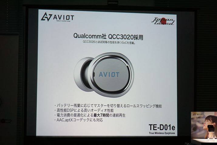 「TE-D01d」は、クアルコムの最新チップ「QCC3026」を搭載したモデル。同社は昨年11月に同様のチップを搭載した「TE-D01b」という製品を発売しており、親機・子機の自動制御機能(ロールスワッピング機能)により、安定した接続性とイヤホン単体で9時間というロングバッテリーが好評を博していたが、新モデルではこれらのDNAを受け継ぎつつ、さらに細部のブラッシュアップを図ったという。