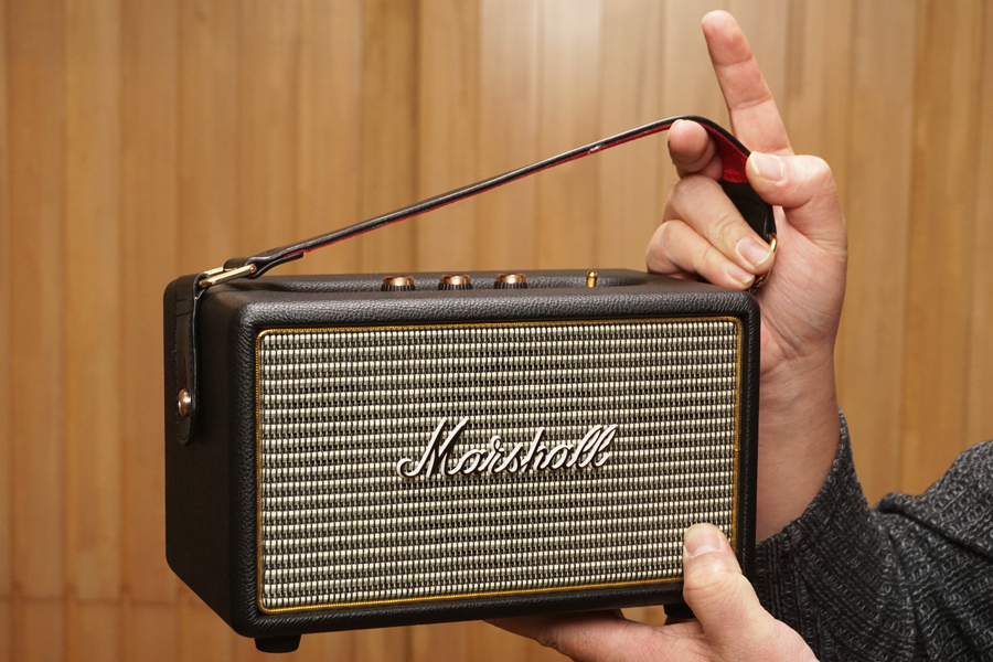 マーシャル製ギターアンプのデザインを取り込みつつ、約24.2(幅)×14(高さ)×14(奥行)cmという(上位機種に比べて)比較的コンパクトなボディサイズにまとめられたBluetoothスピーカー。ドライバーユニットは口径は異なれどツイーター2基+ウーハー1基という構成は上位モデルと同じ。ギターアンプ然としたダイヤルのBASS、TREBLEを用意する点も共通だ。いっぽうで、アナログ入力は3.5mmステレオミニ端子のみ。そのかわり、バッテリーを内蔵して最大約20時間再生可能など、サイズに見合った使い勝手のよさにも配慮されている。