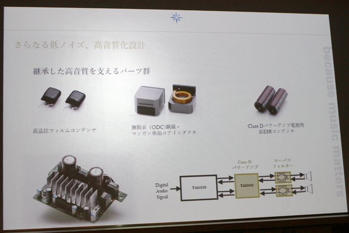 もちろん使用パーツにもこだわっており、デジタルパワーアンプの要となるPWMプロセッサーにローノイズタイプを使用するほか、超低ESR伝導性ポリマーコンデンサーを採用して低ノイズ化するなど、細かい部分でより高音質化を図った。
