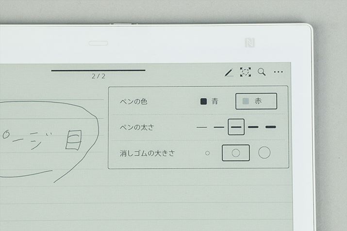 QUADERNO上だと表示はすべて黒ですが、ペンの色は青と赤の2色から選択できます
