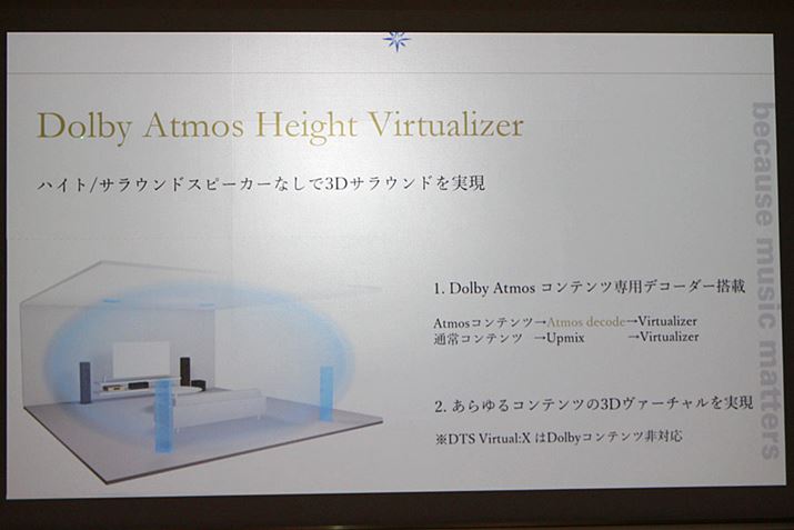 ハイト/サラウンドスピーカーのない状態で、Dolby Atmosのようなイマーシブサウンドを再現する「Dolby Atmos Height Virtualizer」