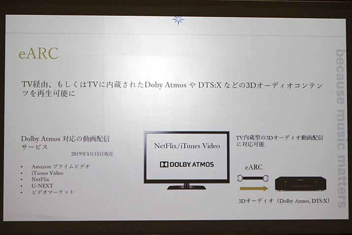 なお、発売後のファームウェアアップデートにより、ドルビーの「Dolby Atmos Height Virtualizer」にも対応予定。こちらは、トップスピーカーのない環境でDolby Atmosのようなイマーシブオーディオ体験を可能とする技術だ。