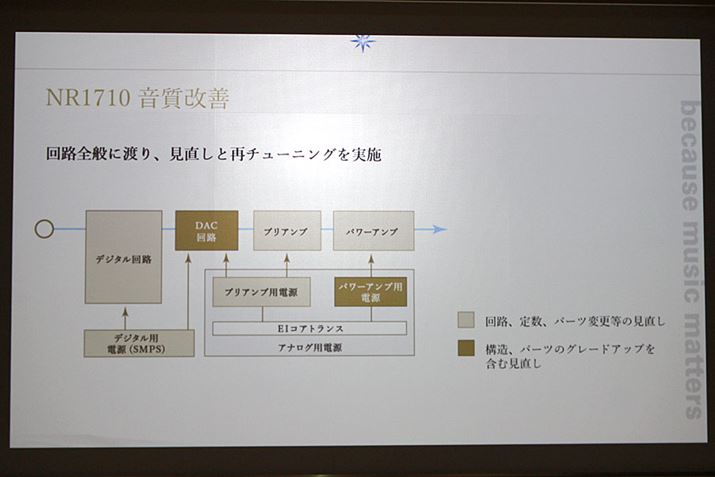 7chのディスクリート・パワーアンプを搭載し、全チャンネルを同一構成・同一クオリティとしているのは従来と同じ。加えてNR1710は、従来モデルをベースに回路基板を再設計している。特に大きいのはDACを専用基板に配置する新設計にしたことで、これによってより見通しのいいサウンドを狙った。そのほか、信号ラインやグラウンドのパターンを最適化し、パーツ品種や定数も見直すなど全面的に強化。「機能」だけでなく、「音質」の面でもしっかりブラッシュアップを図っている。