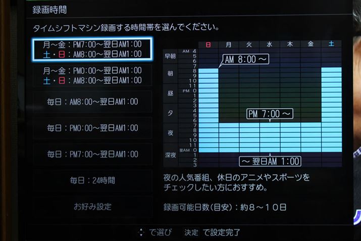 タイムシフト録画する時間帯も設定できます。2TBのUSB-HDDを接続し、「平日:PM19:00〜翌日AM1:00/土日:AM8:00〜翌日AM1:00」の設定にしたところ、約8〜10日分を保存しておくのが可能ということに。設定中に録画可能日数の目安が表示されるのも便利