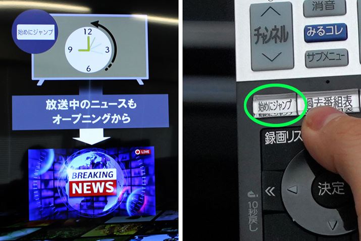 たとえば、平日夜遅くに帰宅して、放送中のニュース番組を途中から見始めることってありますよね。「今日のトップニュース何だったんだろう」と思っても、もう終わってしまっている状態。しかし、そこで「始めにジャンプ」ボタンを押せば、一気に番組の冒頭に飛べるので、トップで取り上げられたニュースから見始めることができるわけです。インターネット放送のアーカイブを再生しているような感覚で、放送中のテレビを見られるんですよ。