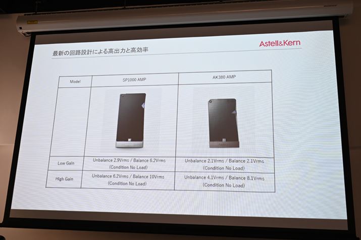 「SP1000 AMP」と「AK380amp」の性能を比較したスライド。バランス/アンバランス接続ともに出力性能が向上している
