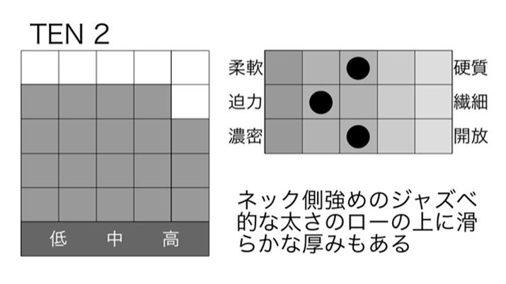 ここから「TEN」グループですが、いきなり新モデルの登場です。従来は「NINE 1」と「TEN 3」の間が価格的にかなり跳んでいたのですが、そこに「NINE 2」とこの「TEN 2」が入ってきた形となります。