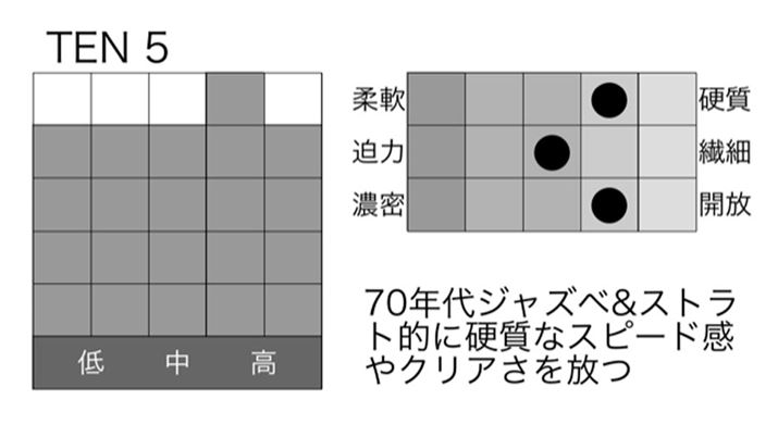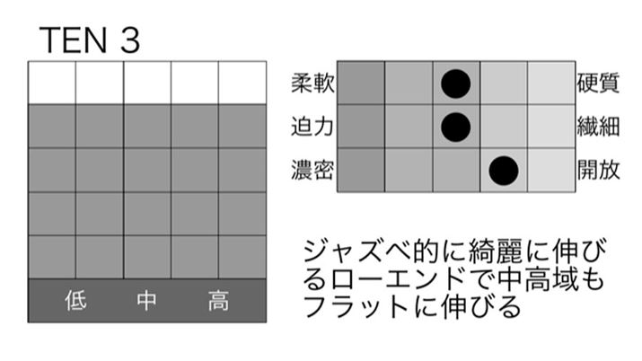 TENグループの中でというかラインアップ全体を見ても、特にフラットな特性を備えるのがこのTEN 3、そしてTEN 5です。低域側の充実に対して中高域側の充実も拮抗し、全帯域により一層のスピード感やキレが加わっています。特にベースやドラムはぐっと低く沈み込んだ低重心のままでキレを増しているので、リズムの正確性と迫力、どちらも大満足!