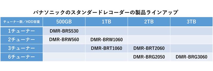 パナソニックの例。搭載チューナーと内蔵HDD容量という2つのスペックの組み合わせで概ね機種を選べるようになっている