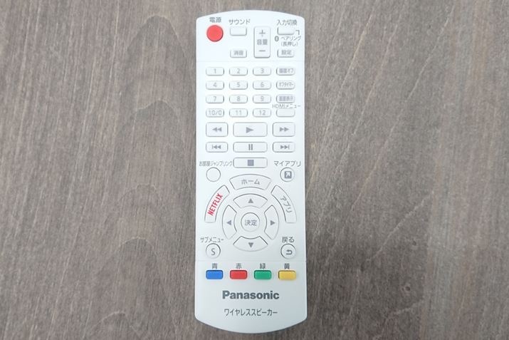 付属の専用リモコン。電源ON/OFFやボリューム調整、入力切り替えなどの本体のボタンで操作できる機能以外を操作する場合は、こちらのリモコンを使用する
