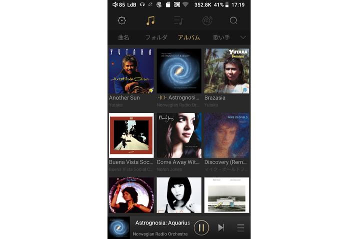 Cayin版「HiBy Music」の画面。再生時にはステータスバーに現在のデシベルやサンプリングレートが表示される