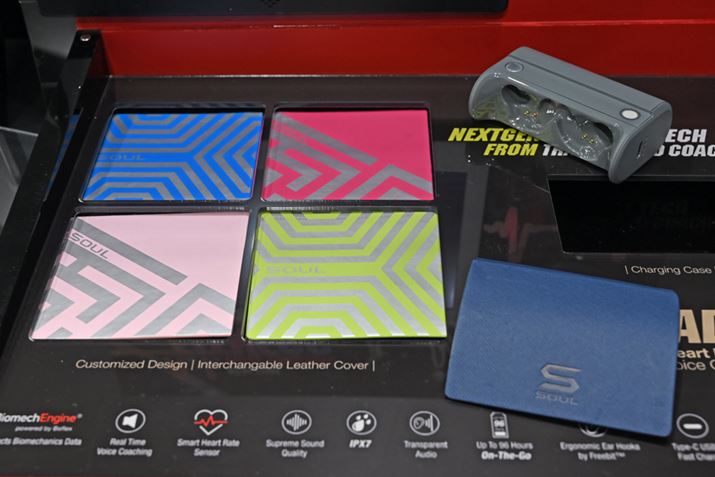 ブースの奥にひっそりと参考展示されていたのは、完全ワイヤレスタイプのランニング向けイヤホン「BLADE」。「Run Free Pro Bio」と同じバイオメカエンジンに加え、こちらは心拍計まで備え、防水性能もIPX7にまで対応した高機能モデルという位置付けになるそうだ。ユニークなのが、イヤホンを充電する専用ケースのフタがマグネット式になっており、好みに合わせて交換できるようになっていること。カラフルなデザインを施した交換パーツも展示されていた。