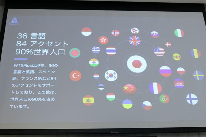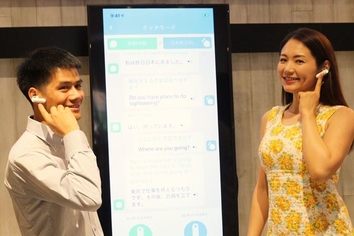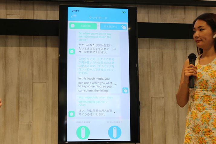 イベント当日は、「WT2 Plus」によるリアルタイム翻訳のデモンストレーションも行われた。「タッチモード」でのデモンストレーションだったため実際の音声を聞くことはできなかったが、音声入力後、5秒ほどでさくさくと翻訳されていく様子が、用意されたディスプレイで確認できた。日本語訳を見ると完璧とまではいかないが、意味はわかるので、会話は問題なく成立するだろう。