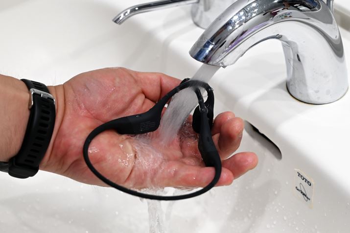 耳をふさがないで音楽を楽しめるという製品の特性から、スポーツシーンでの利用を想定している人も多いと思うが、そういった人にとって汗をかいても水で洗え、雨で濡れても壊れないという防水性能はかなり重要な要素といえる。これまでの「TREKZ AIR」は、microUSB端子で充電する形だったため、水の侵入を防ぐキャップがあるとはいえ、水が入り込む可能性はゼロではなかったわけだが、専用形状の端子を採用することで、水の侵入によるトラブルが格段に少なくなったというわけだ。