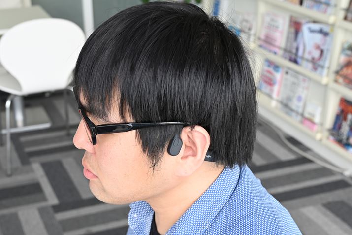 AfterShokz「Aeropex」を装着してみた。耳掛け部分の形状も工夫されており、適度な側圧とあわせて頭部にしっかりとフィットしてくれる。メガネとの干渉もまったくない