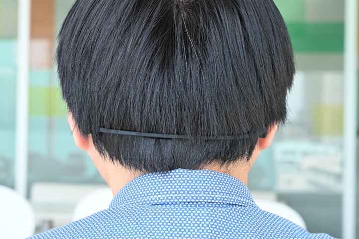 後頭部はこんな感じ。ケーブル一体型のスポーツイヤホンによくあるフィット感調整用のアジャスターなどはまったくなく、形状記憶素材のワイヤー部分のみで頭部にフィットしていることがわかるはずだ