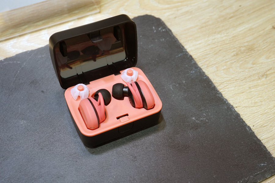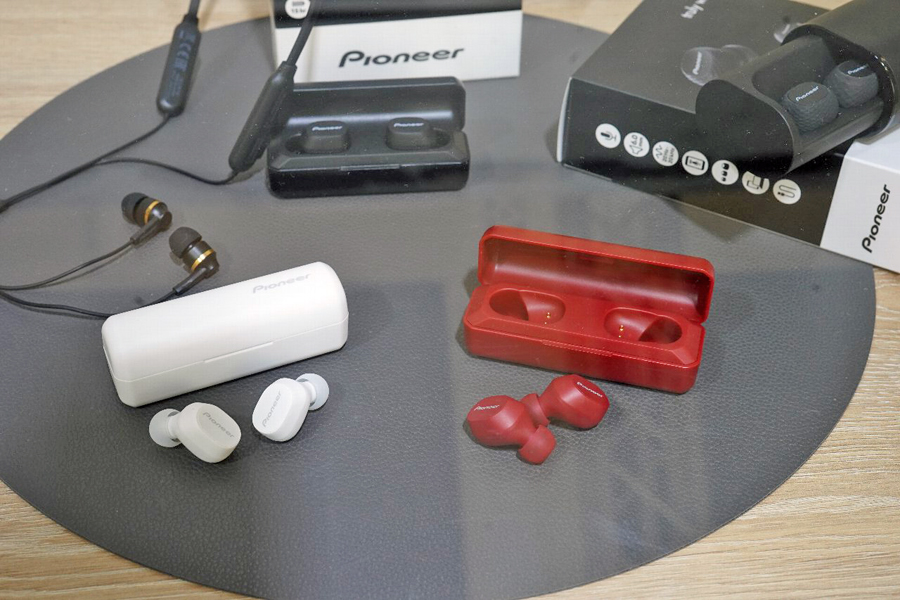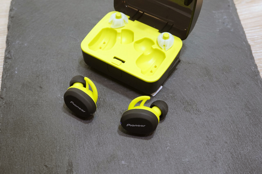 パイオニアは完全ワイヤレス2機種を投入。「C5」はイヤホン本体もケースも小型化を図ったモデル。連続再生は最大5時間で、充電ケースで合計15時間の使用が行える。IPX5の防水性能で外音取り込みにも対応。価格は109ユーロ程度。「E9」はスポーティーな色のウィング付きのモデルで、IPX7の防水対応。欧州では149ユーロで発売。