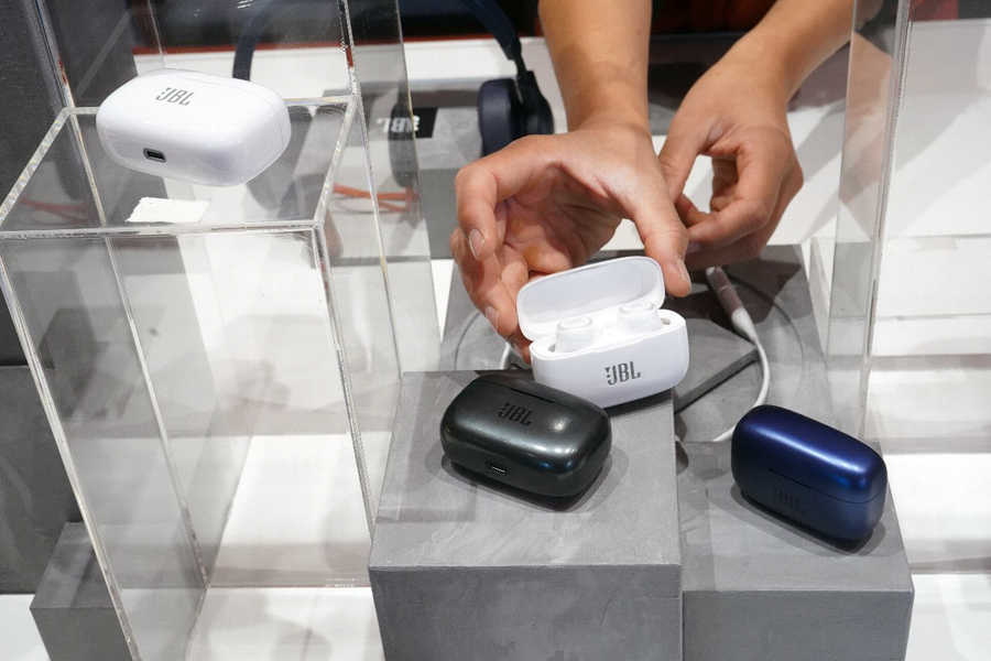 JBLはプライベートブースで日本未発売の製品群を出展。「LIVE300TWS」は外音取り込み対応とボイスアシスタント対応が特徴のモデルで、防水性能はIPX5。イヤホン単体で6時間。充電ケースと合わせて18時間駆動に対応する。価格は149ユーロで、欧州では11月に発売。