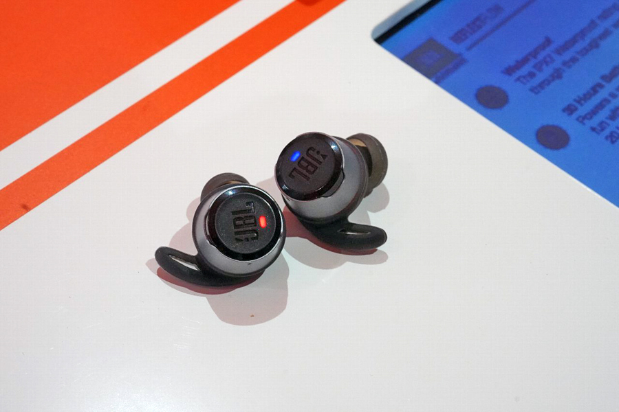 JBLによるもうひとつの完全ワイヤレスイヤホン新製品が「REFLECT FLOW」で、こちらはフィットネスなどスポーツ向けのモデル。IPX7の防水性能を備え、イヤホン単体で10時間、充電ケースと合わせると30時間駆動に対応する。トークスルー、アンビエントアウェアにも対応。