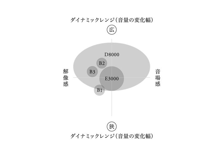 finalがBシリーズの発表会時に公開した同社イヤホン・ヘッドホンのプロット図。縦軸にダイナミックレンジの変化幅、横軸に解像感と音場感を配置したプロット図において、Bシリーズはそれぞれこういった配置になるそうだ
