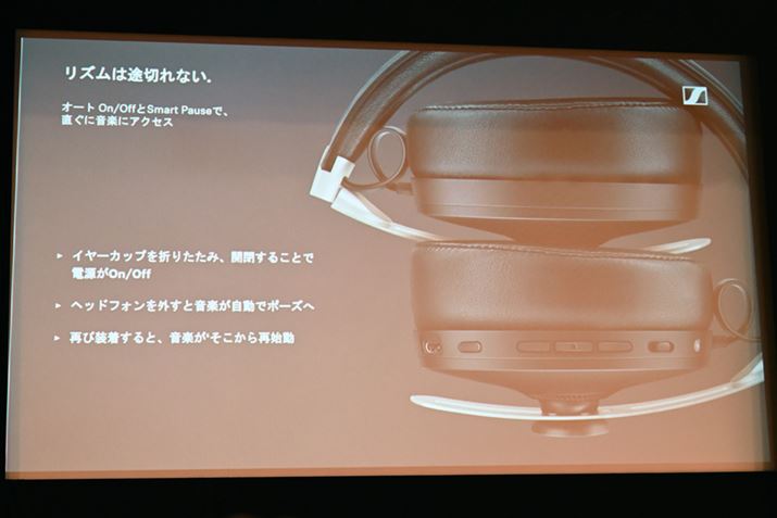 今回、短い時間ではあるが、実際に「MOMENTUM Wireless」を体験することができた。耳への圧迫感を低減させる「プレッシャーカット」はもちろんだが、ノイズキャンセリング性能がもっとも高い「通常」設定でも、ノイズキャンセリングヘッドホンでありがちな耳への圧迫感は少なかった。他社のノイズキャンセリングヘッドホンに比べると、ノイズ低減効果は気持ち抑えめだが、その分圧迫感がなく、通常のヘッドホンのような自然なリスニング体験に近い。厚めに作られたイヤーパッドのおかげもあって、長時間リスニングしても聴き疲れしなさそうだ。「外音取り込みモード」のミックスも自然で、ノイズキャンセリング効果が強いことが必ずしも最高の音楽体験ではないというゼンハイザーの主張もうなずける。