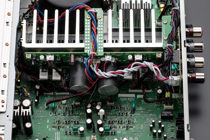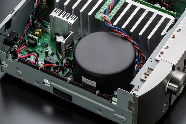 電源部には大容量トロイダルトランスを搭載するほか、15,000μFのカスタムブロックコンデンサー2基をパワーアンプ出力基盤にダイレクトマウントする設計で、電源ラインを最適化。また、新しいLAPTパワートランジスタと大電流ドライバートランジスタの採用や、徹底したディスクリート化、低インピーダンス化により、瞬時電流供給能力を従来モデルPM7005比で45%アップさせている。これにより、上級モデルに迫るスケール感のサウンド再現を図った。