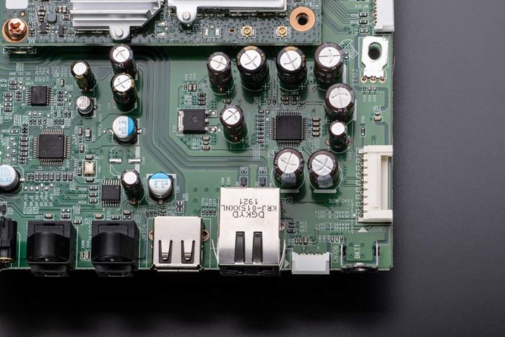 また、デジタルオーディオ回路は専用のシールドケースに封入する設計で、ネットワーク、USB、Bluetoothなどのデジタル信号を扱うデジタルオーディオ回路から発生する高周波ノイズを抑制する。電源ラインへの流入ノイズはデカップリングコンデンサーを用いて除去。また、アナログ信号への影響を極力抑えるため、ネットワーク、USBメモリー、Wi-Fi、Bluetoothの各回路をオフにする機能やディスプレイを消灯する機能も実装している。